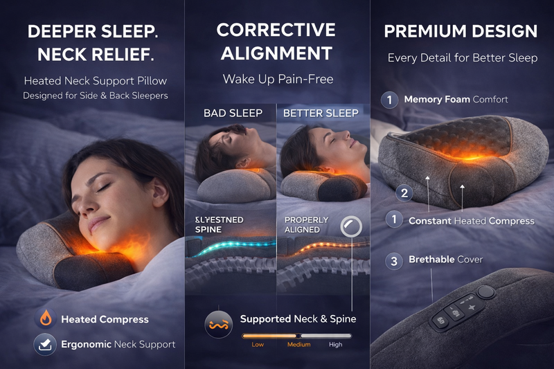 Built with ergonomic cervical support and therapeutic heat, this pillow gently cradles your neck and shoulders to reduce pressure, relax tight muscles, and promote deeper, more restorative sleep.